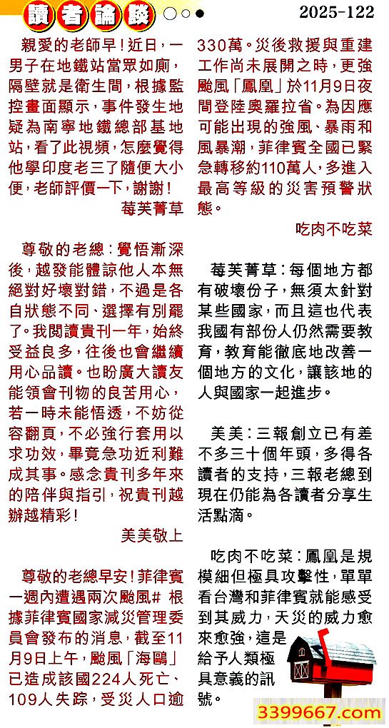 3.尊敬的老總早安!菲律寶一週內遭遇兩次颱風#根據菲律賓國家減災管理委員會發布的消息,截至11月9日上午,颱風「海鷗」已造成該國224人死亡、109人失踪,受災人口逾330萬。災後救援與重建工作尚未展開之時,更強颱風「鳳凰」於11月9日夜間登陸奥羅拉省。為因應可能出現的強風、暴雨和風暴潮,菲律寶全國已緊急轉移約110萬人,多進入最高等級的災害預警狀態。====吃肉不吃菜
