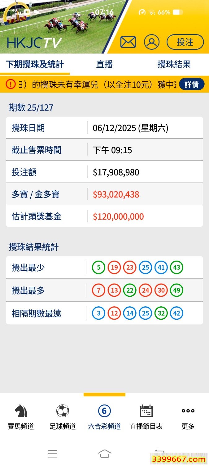 由於週二(2025年12月2日)的攪珠未有幸運兒(以全注10元)獲中頭獎,因此約有9,300萬元多寶累積撥入至週六(2025年12月6日)的攪珠內。若以10元一注獨中,估計頭獎基金高達1億2,000萬元。為預留更多時間讓顧客購買彩票,原定於週四(2025年12月4日)的攪珠將不會舉行。
