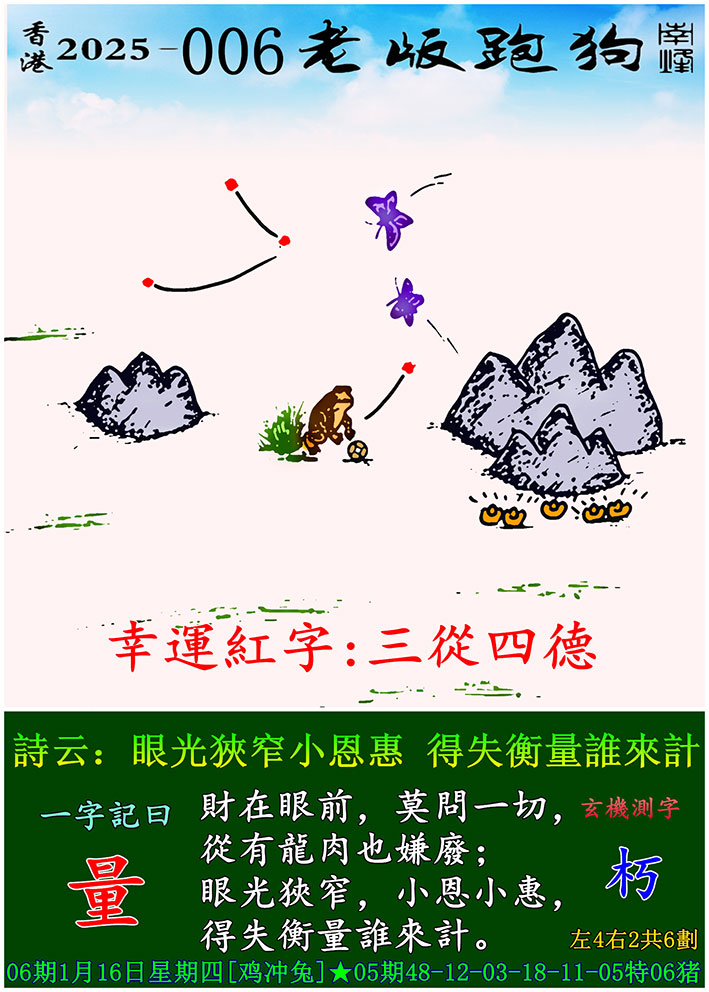 | 主题 :006期老版跑狗一字記之曰:【量】 玄機測字:《朽》 |