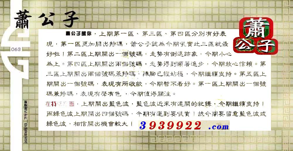 | 主题 :063期:六合皇金句/老总论码/萧公子/林大师/五行夺码/老总信箱截 |