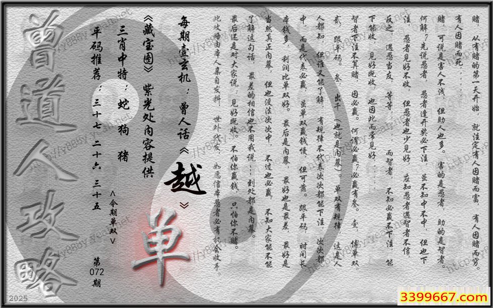 主题 :072期藏寶圖 新:门外风波烟浪恶 老:愿君书札来双鲤 禁:兔 禁:3尾