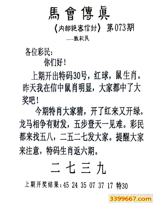 073期:首发推荐:≮馬會傳眞≯→(香港正版)