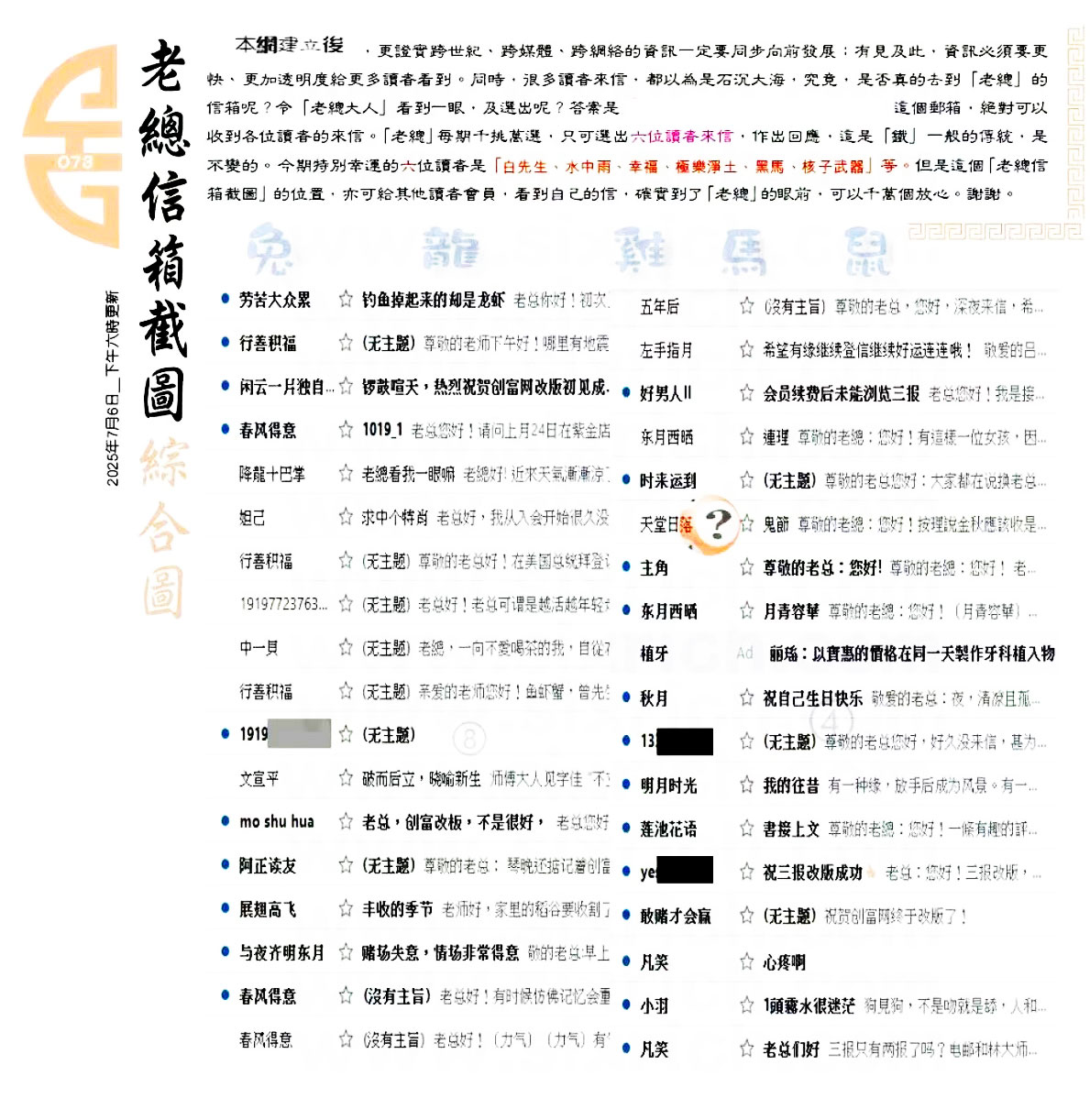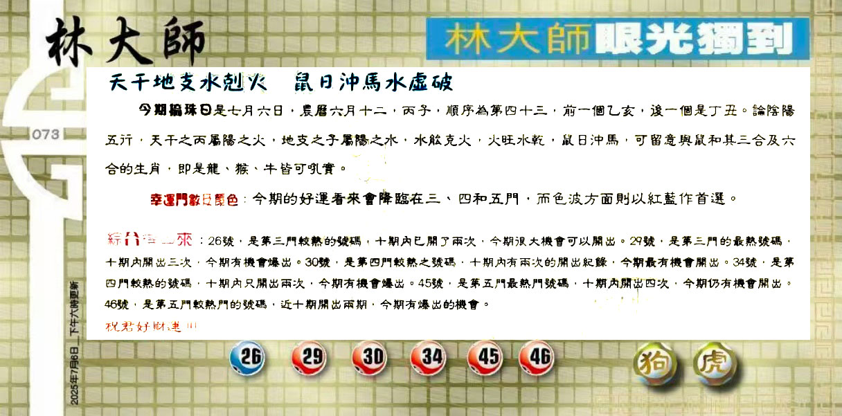 | 主题 :073期:六合皇金句/老总论码/萧公子/林大师/五行夺码/老总信箱截 |