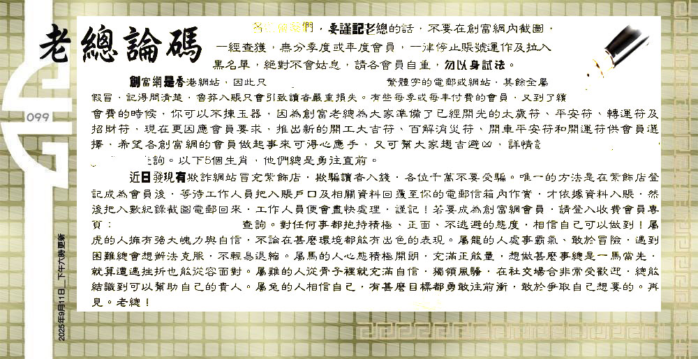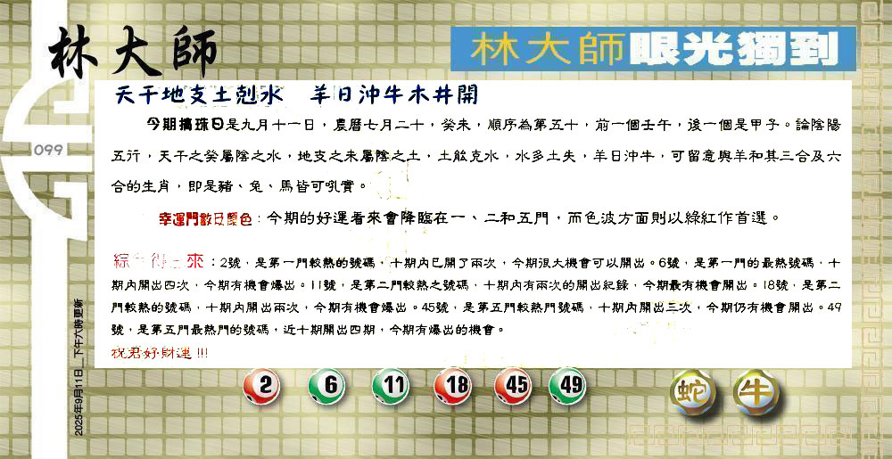 | 主题 :099期:六合皇金句/老总论码/萧公子/林大师/五行夺码/老总信箱截 |