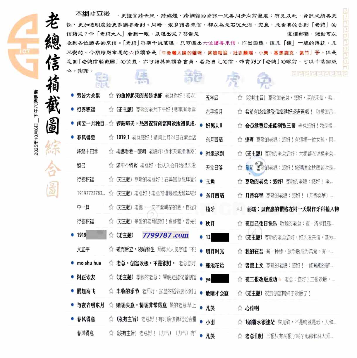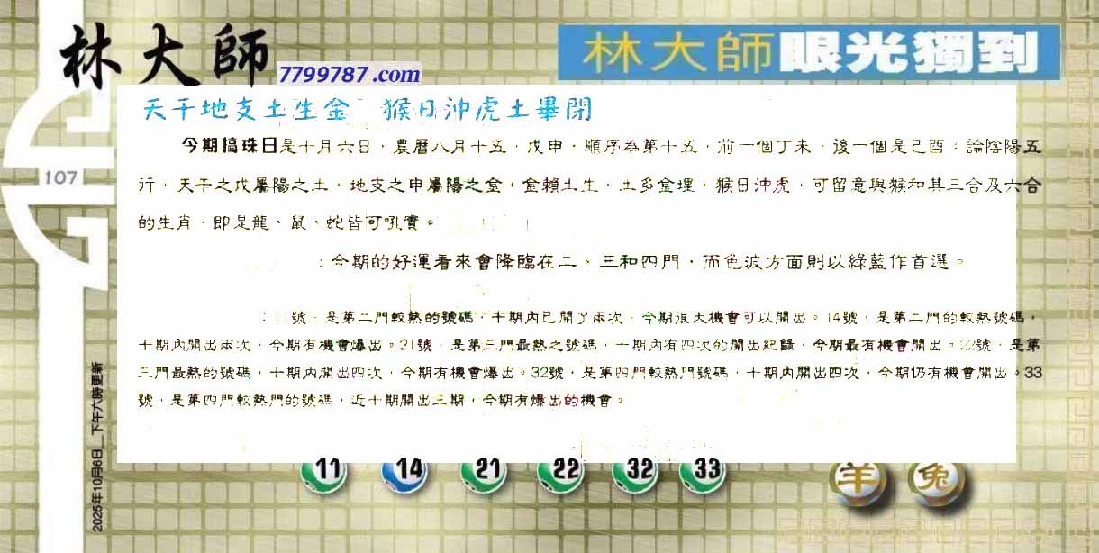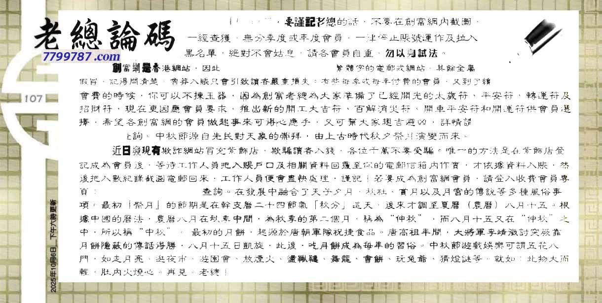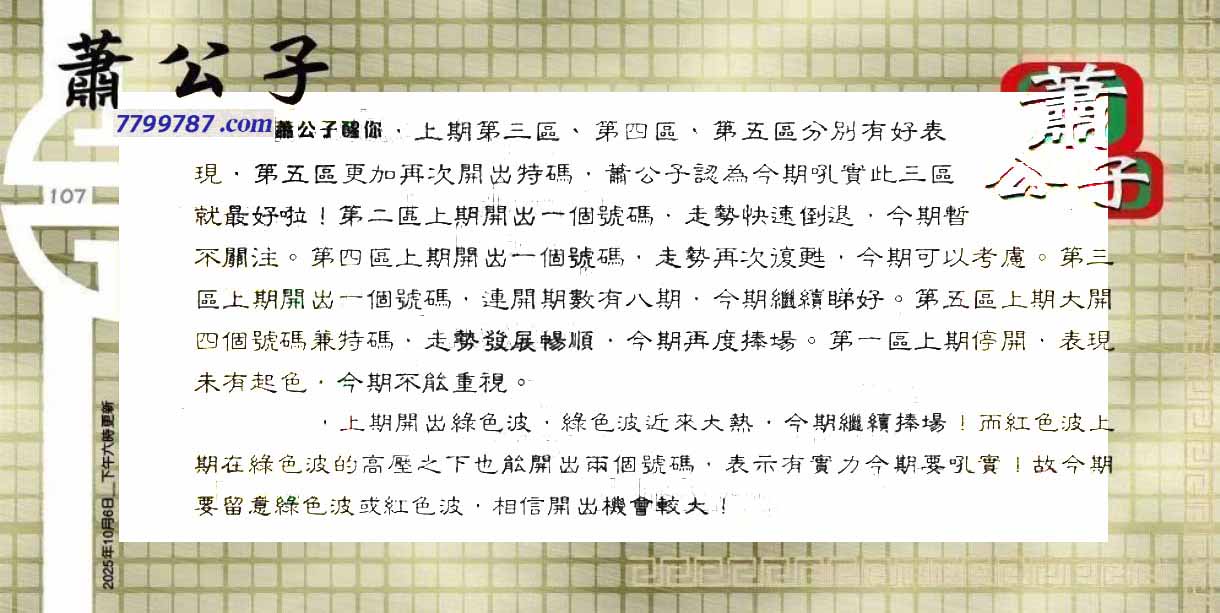 | 主题 :107期:六合皇金句/老总论码/萧公子/林大师/五行夺码/老总信箱截 |