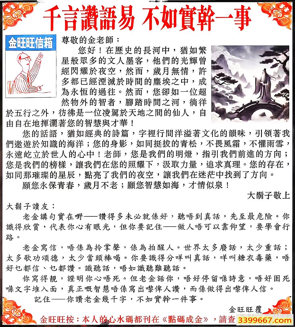 | 主题 :113期:金旺旺信箱彩民推荐→→《千言讃語易 不如實幹一事》 |