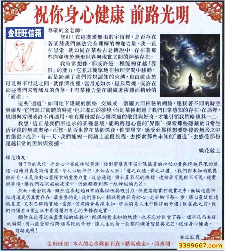 主题 :067期:金旺旺信箱彩民推荐→→《祝你身心健康 前路光明》