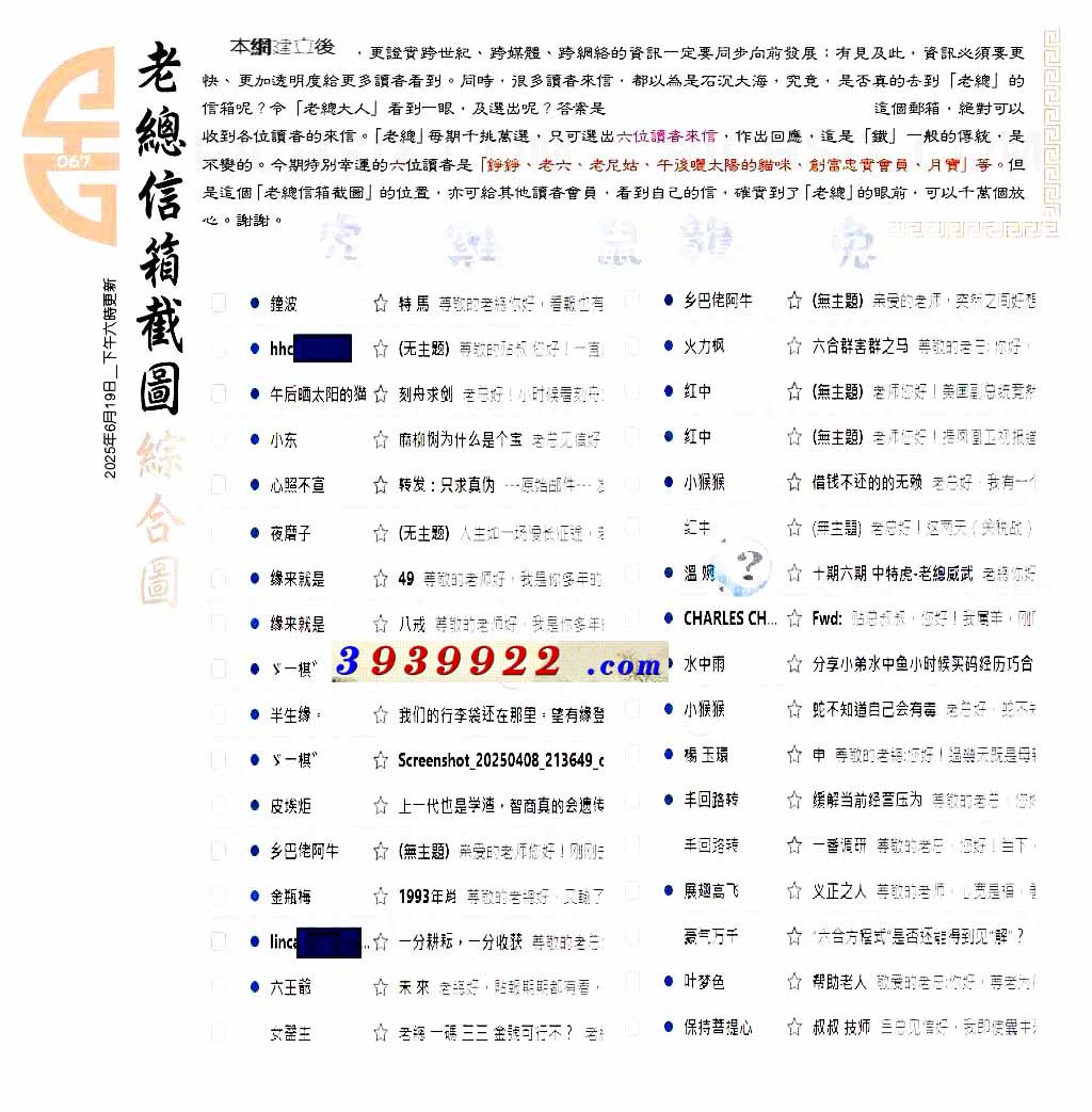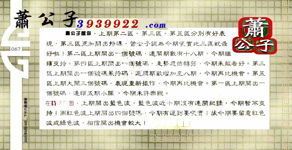 | 主题 :067期:六合皇金句/老总论码/萧公子/林大师/五行夺码/老总信箱截 |